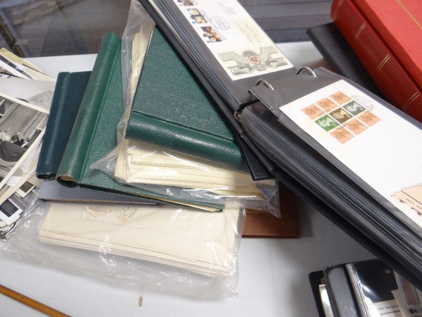 An album of First Day covers, sundry junior albums of stamps, loose pages of stock, foreign stamp philatelic material etc