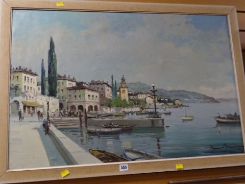 Continental School oil on canvas - Italian lake town waterfront scene with moored boats looking towards distant hills, entitled verso 'Lake Como', signed (indistinct)