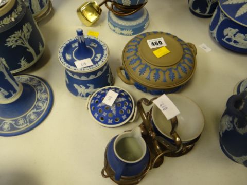 A parcel of Wedgwood Jasperware including brown covered dish with twin-handles and overlaid blue, a ring stand, condiment set etc