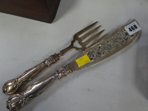 A pair of hallmarked silver fish servers with blade and handle in silver