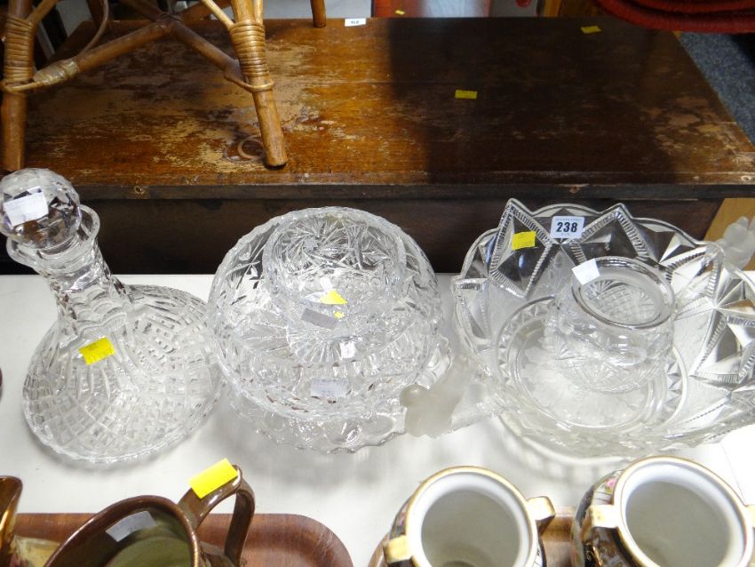 A parcel of glassware including good quality cut glass decanter, a trifle bowl with squirrel handles etc
