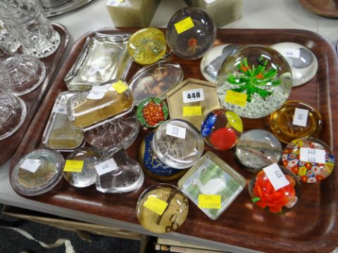 A collection of vintage glass paperweights, many of a tourism nature