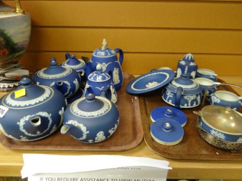 A quantity of blue Wedgwood Jasperware teapots and other itemsCondition report: A few small chips to the spout of one teapot, one spout broken on another, one spout has been completely restored, there are a few other small bits of restoration, sugar bowl is good, and all other bits are good, no staining on the whites just very dirty.