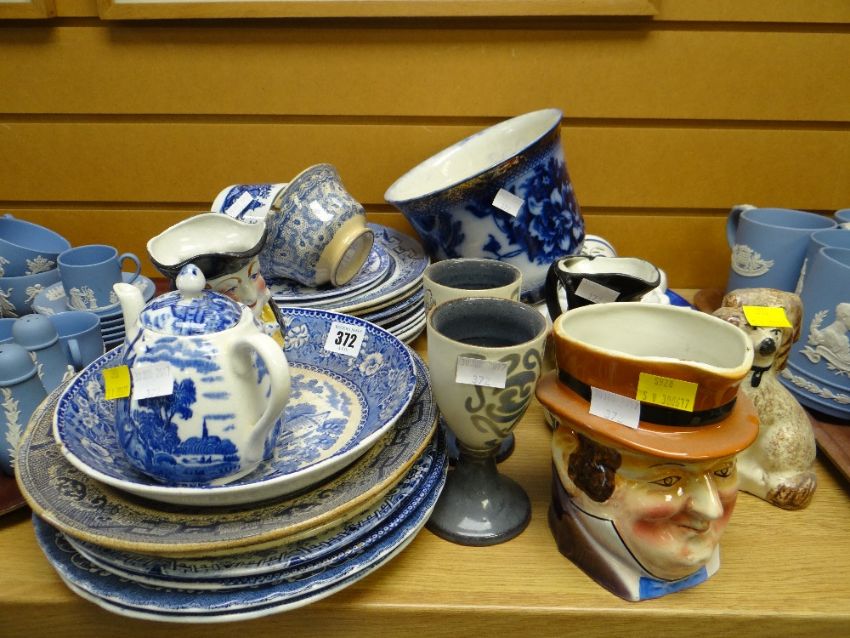 A parcel of mainly antique pottery including blue & white items, Toby jug etc