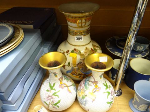 A pair of twentieth century cloisonne vases and an Oriental crackle glazed pottery vase