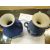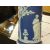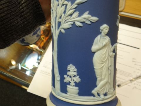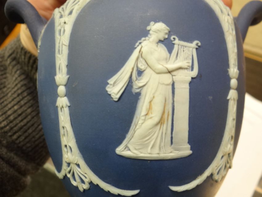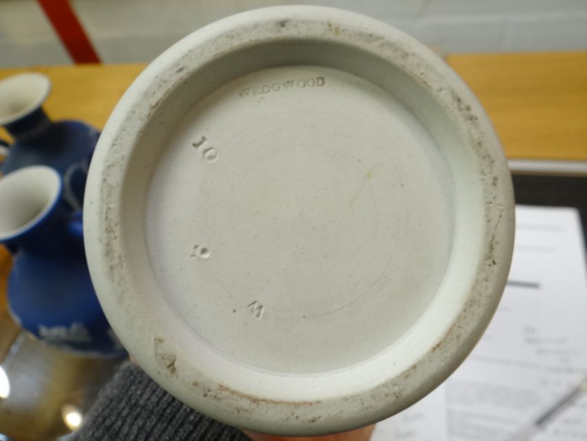 Three items of blue Wedgwood Jasperware comprising two twin-handled vases and a cylindrical vase Condition report: no crazing, there seems to be small cracks to the surface on one of the twin-handled vases