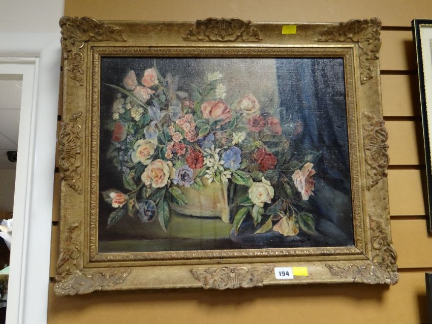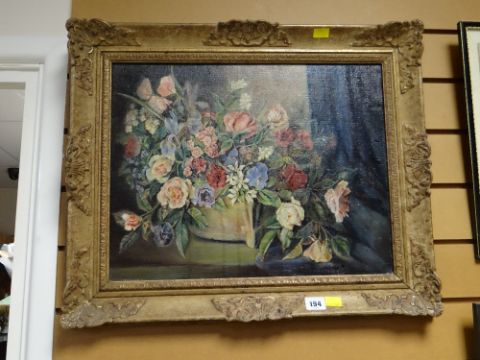 Framed oil on canvas, study of a bowl of flowers and roses in a good gilt frame