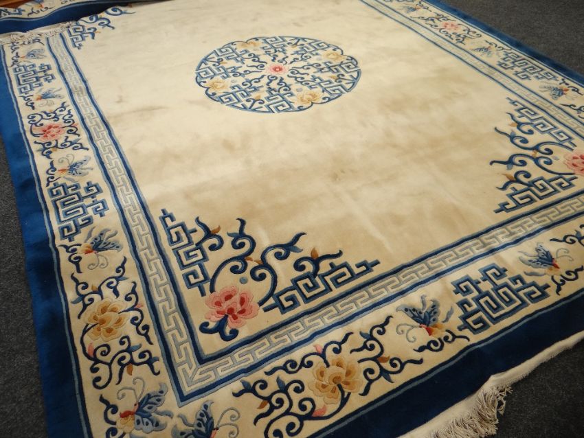 A large Oriental ivory and blue bordered rug, 365 x 274cms Condition report: the rug is in excellent condition, there are no marks or wear.