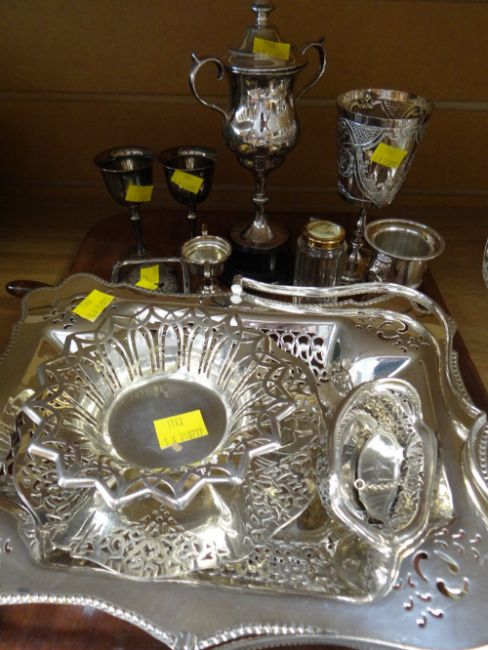 A tray of various EPNS including basket, trophies, decanter labels etc