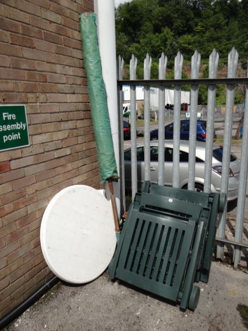 Two green plastic garden loungers, circular garden table and parasol (outside)