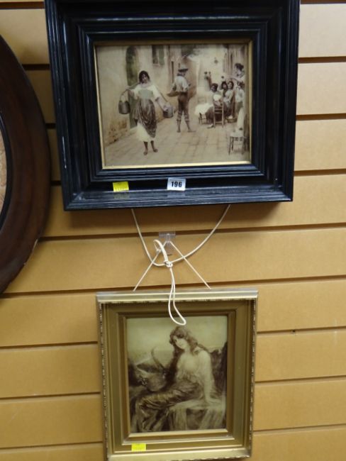 Two framed oleographs - continental street scene and female playing a lyre