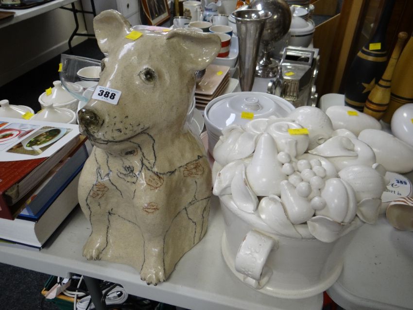 Ornamental ceramic bulldog together with a ceramic white bowl of fruit