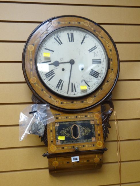 An inlaid American wall clock with circular face and Roman numerals
