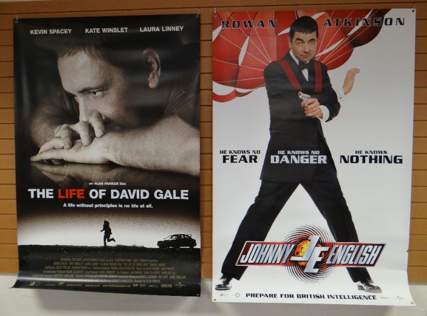 Four original cinema lobby wall hangs, including Men In Black 2, About a Boy, Johnny English & The Life of David Gale, each 216 x 131cms together with two original 6-sheet cinema posters for The Matrix Reloaded and The Time Machine each 180 x 120cms