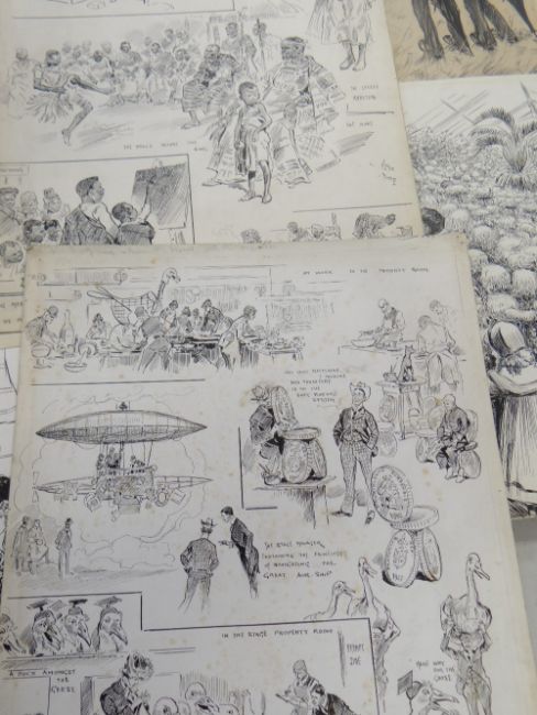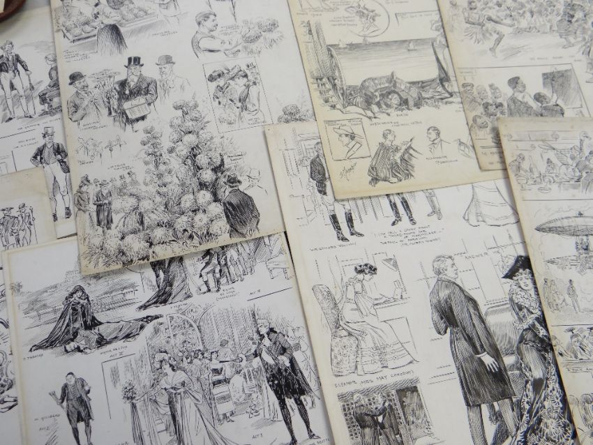Original drawings circa 1900 - 1905 for Daily Graphic, some signed, many of a social commentary theme with figures of the period, also Dickens illustrated notes