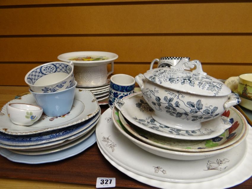 Tray of vintage china mainly plates including blue & white together with a vintage black & white scotch whisky water jug, small Deputy dawg plate etc