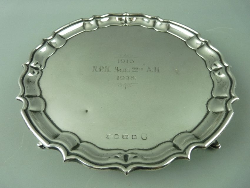 A HALLMARKED SILVER CARD TRAY with wavy border on three hoof feet, Birmingham 1935, 11.5 troy ozs, with inscription to front, 20.5 cms diameter
