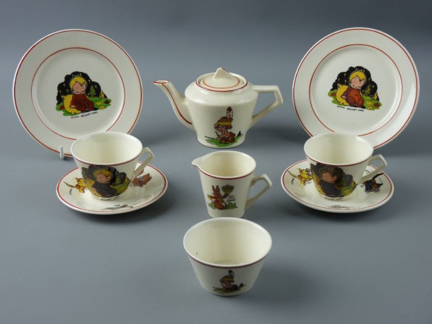 A WADE HEATH POTTERY WALT DISNEY CHILD'S TEA FOR TWO SET, including 'Hiawatha' teapot with lid, two 'Lullaby Land' side plates, two 'Three Little Kittens' saucers, two 'Lullaby Land' cups (one chipped with hairline), 'Hiawatha' sugar basin and 'Funny Little Bunnies' milk jug, the plates and saucers marked 'Wade Heath, England', (some crazing)