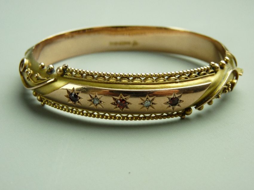 A NINE CARAT GOLD HOLLOW BANGLE, half decorated with a centre oblong band having three small rubies and two diamonds and surrounded by end scrolls and beadwork edging etc, 14 grms