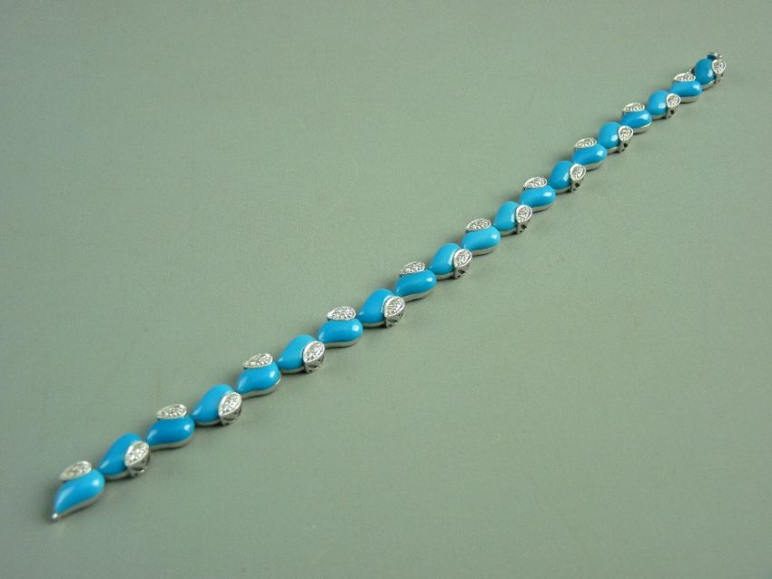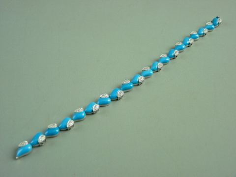 AN EIGHTEEN CARAT WHITE GOLD DIAMOND SET TURQUOISE COLOURED HEART LINK BRACELET of twenty dyed howlites and approximately forty tiny diamonds, total 16.3 grms