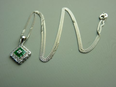 AN EIGHTEEN CARAT WHITE GOLD EMERALD & DIAMOND KITE SHAPED CLUSTER PENDANT with fine link chain, the eight square faceted diamonds having seventeen surrounding round brilliant cut diamonds, total weight 4.3 grms