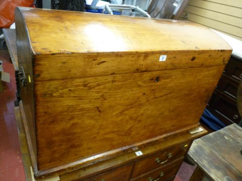 AN ANTIQUE PINE DOME TOPPED CAPTAIN'S CHEST with iron carry handles, 57 cms high, 91 cms wide, 50.5 cms deep