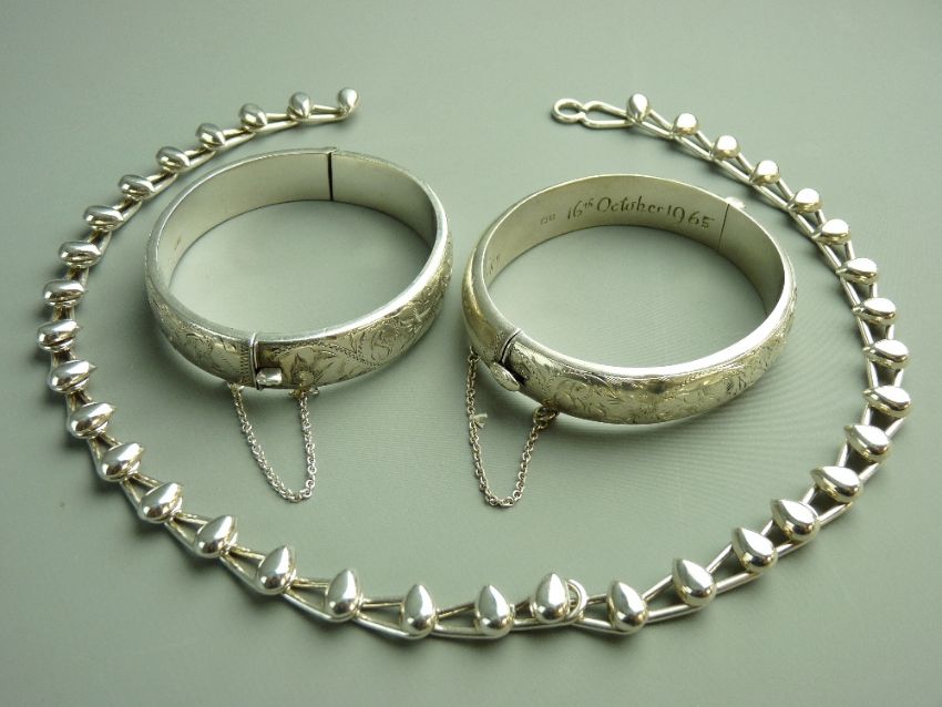 TWO HALLMARKED SILVER LADY'S BANGLES and a modern heavy gauge silver neck chain, the bangles with bright cut decoration hinged with clasp openers and safety chains, one with engraving to the interior 'Beverley, 16th October 1965', the neck chain with peardrop links, 45 cms long, marked 925, 3.1 troy ozs total