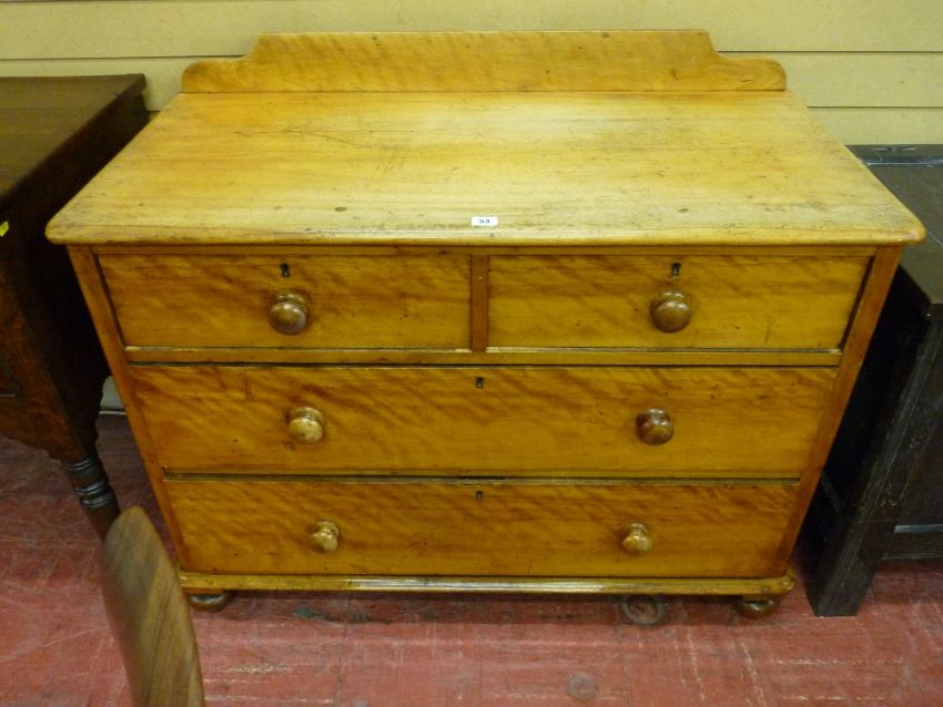A VICTORIAN SATIN WALNUT RAILBACK CHEST of two short over two long drawers having turned wooden knobs, raised on bun feet, 91 cms high overall, 101.5 cms wide, 55 cms deep