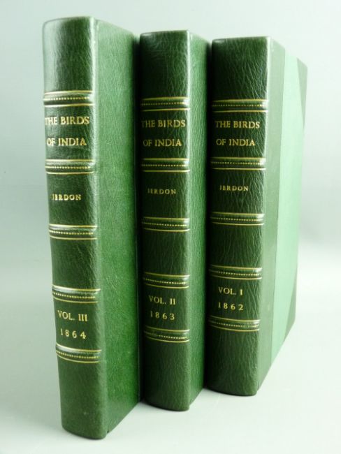 BOOKS - 'The Birds of India' by T C Jerdon, three volumes dated 1862, 3 and 4, Calcutta published, volumes one and two printed for the author by the Military Orphan Press, volume three by George Wyman & Co, rebound circa 1978 in dark grained green leather and cloth, the spines titled and highlighted in gilt (interior pages somewhat browned with some indicators and reader notes in pencil along with some page edge repairs)