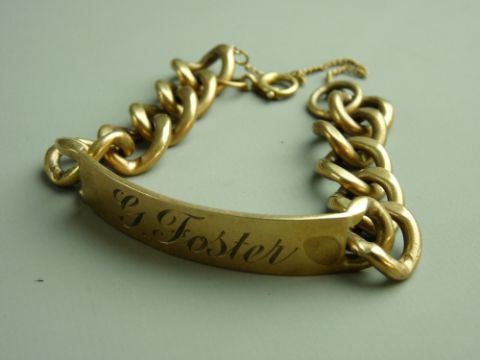 A NINE CARAT GOLD IDENTIFICATION BRACELET inscribed 'G Foster' with large links and safety chain, 50 grms