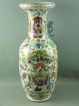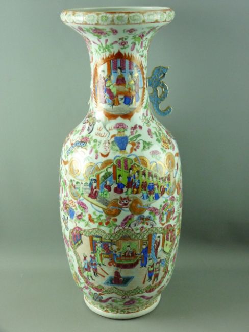 A LARGE 19th CENTURY CHINESE CANTON DECORATED VASE, the body with varied and abundant decoration of coin bordered panels and further framed panels depicting various gatherings of people, interspersed with precious objects, fruits, flora, butterflies and lizards, flame ringed neck panels with flat stylized dragon handles, (one missing), the flared rim with gilt and floral decoration, base unmarked, 63 cms high