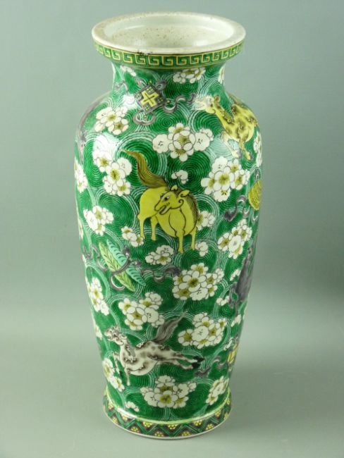 A CHINESE 19th CENTURY VASE decorated with galloping horses, interspersed with ribbon tie decorations and blossom on a swirling green background in the Kangxi Period style, 42 cms high, base unmarked