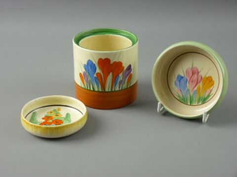 THREE CLARICE CLIFF POTTERY ITEMS including an early 7.75 cms diameter pin dish with interior floral decoration, marked to the reverse, painted 'Bizarre by Clarice Cliff, Wilkinsons Ltd, England', a similarly marked jam pot (hairline cracks, no lid) and a Newport Pottery pin dish, 9 cms diameter with backstamp for Newport Pottery, both in 'Crocus' pattern