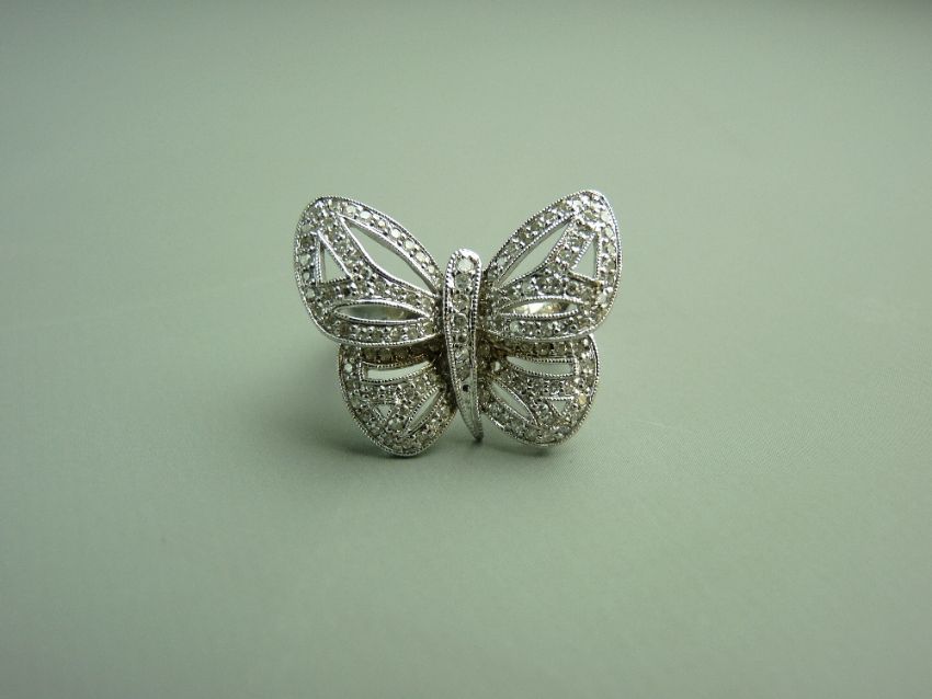 A NINE CARAT WHITE GOLD DIAMOND ENCRUSTED BUTTERFLY DRESS RING, having approximately one hundred and thirty tiny diamonds, visual estimate 0.7 carats, 6.6 grms gross