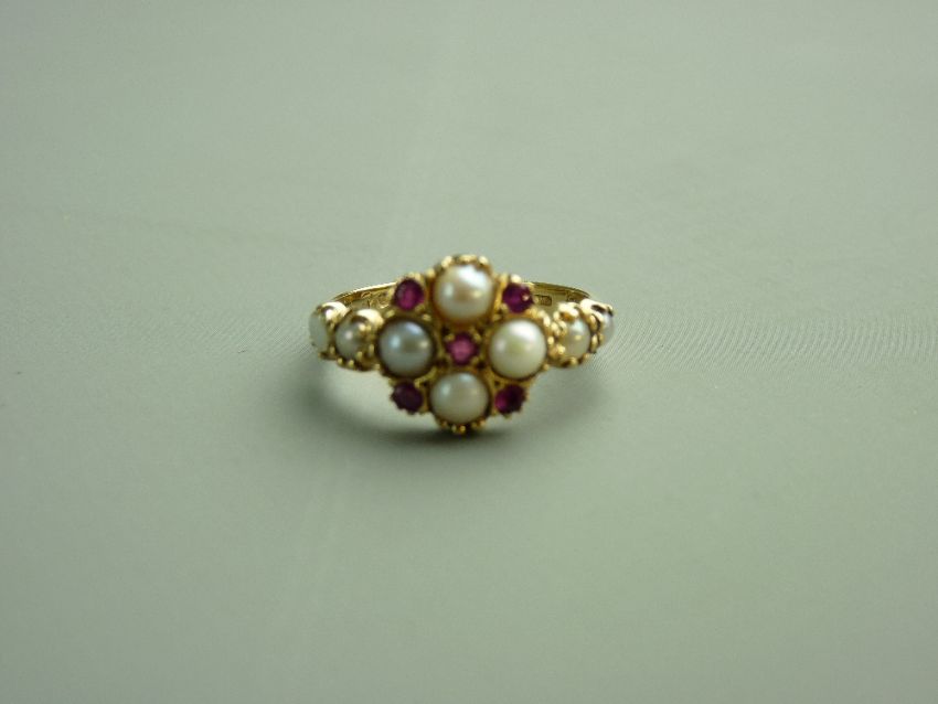 A FOURTEEN CARAT GOLD PEARL (six) & RUBY (five) DRESS RING, 3.2 grms