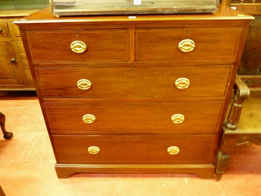 A CIRCA 1900 LINE INLAID MAHOGANY CHEST of two short over three long drawers, with later polished brass oval backplates with swing handles, on corner bracket feet, 107 cms high, 107 cms wide, 52.5 cms deep