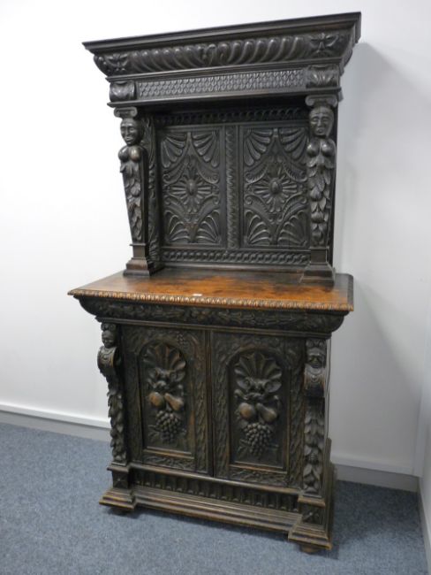 A CARVED OAK FLEMISH STYLE SIDEBOARD. The cornice with fluted decoration over a twin panelled back and figural and fruit supports repeated as corbels to the base flanking twin deep carved fruit decorated doors on an inverted breakfront plinth. 200cms high x 109.5cms wide x 54cms deep.