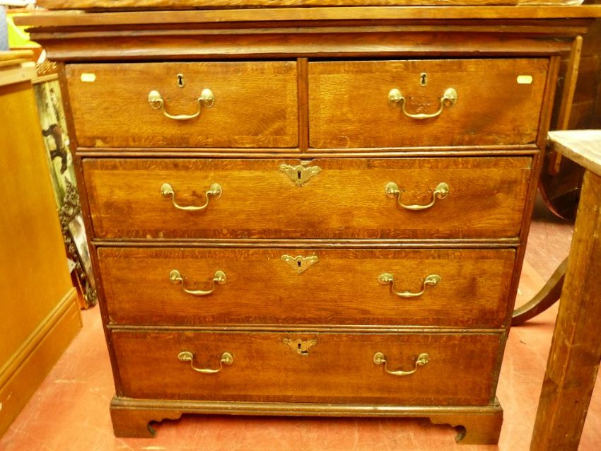 AN EARLY 19th CENTURY RUSTIC OAK CHEST of two short over three long drawers, rectangular top over inverted moulding, crossbanded oak lined drawers with brass pommel backplates and swan neck handles and decorative lock escutcheons on bracket corner feet, 100 cms high, 97 cms wide, 55 cms deep maximum