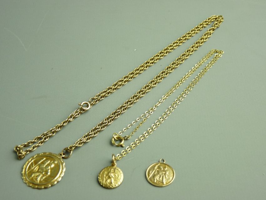 A NINE CARAT GOLD CIRCULAR ST CHRISTOPHER PENDANT on a fine link chain, 10 grms and two other tiny nine carat gold pendants, one with a fine link chain, total 3.3 grms