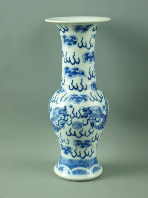 A 19th CENTURY BLUE & WHITE VASE having a long trumpet flared neck over a baluster shaped body, decorated with a pair of five toed dragons chasing a flaming pearl amongst clouds, underglazed blue four character mark to the base, 25.75 cms high
