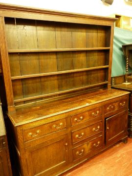AN ANTIQUE OAK DENBIGHSHIRE STRAIGHT FRONT WELSH DRESSER, the wide boarded three shelf rack with reeded side detail, the base with twin plank top and moulded edge over a 'T' arrangement of five pine lined opening drawers with crossbanding and cockbeaded edges, diamond escutcheons and brass oval pommel plates with swan neck handles, the twin base doors with line inlay and brass knobs, on corner bracket feet, 205 cms high, 178 cms wide, 49.5 cms deep (back boards to the rack replaced)