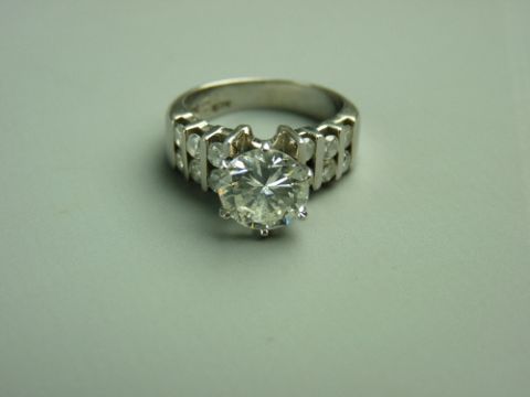A FOURTEEN CARAT WHITE GOLD DIAMOND DRESS RING having a fine white colour solitaire diamond 8mm diameter and with six flanking tiny diamonds either side of the 'L' fitting shank, visual estimate of solitaire 2.3 carats, total weight 7 grms