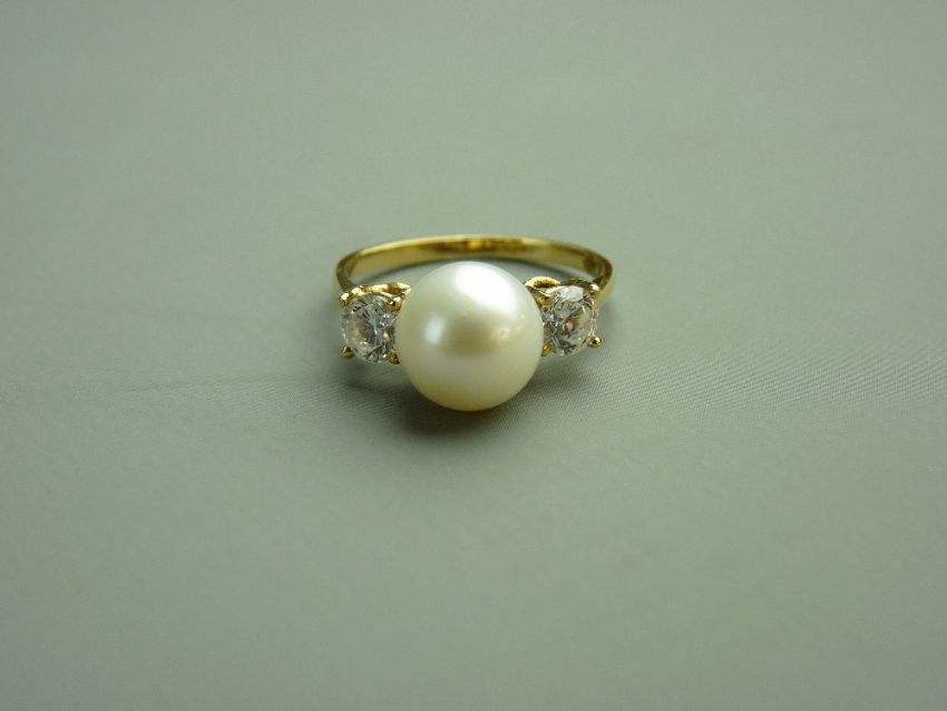 AN EIGHTEEN CARAT GOLD DRESS RING with a large centre pearl and two flanking cubic zircons, 4.2 grms