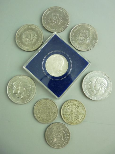 THREE BRITISH HALF CROWNS 1942, 1955 & 1962, 1.3 ozs, five British commemorative crowns and a walleted J F Kennedy 1963 commemorative coin