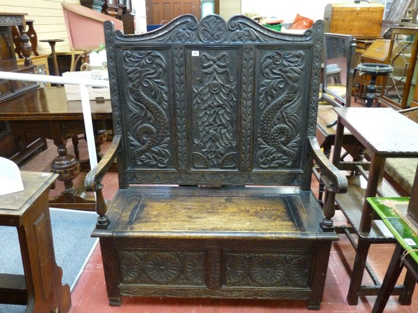 A HIGHBACK CARVED OAK BOX SEAT BENCH, the triple panel back with shaped top rail and mythical creatures flanking a ribbon and floral swag, the swept arms with acanthus decoration on turned supports, the lower section with carved roundels, 132 cms high, 101 cms wide, 52 cms deep