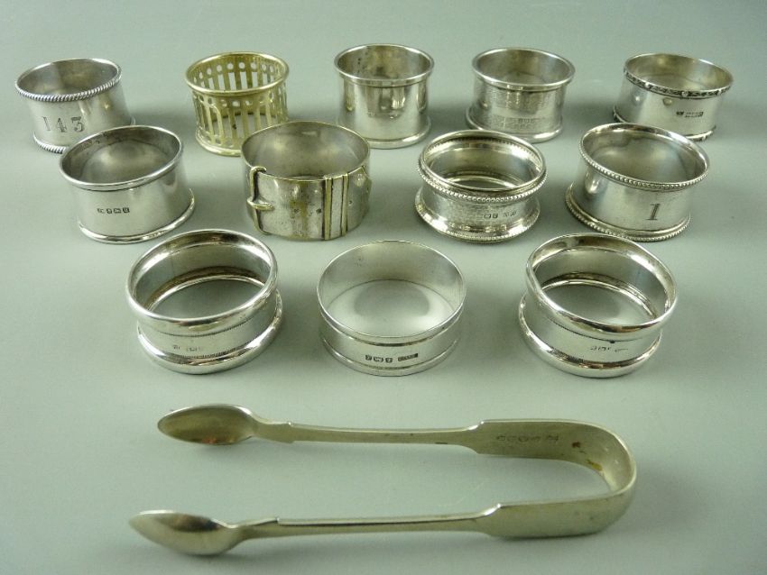 EIGHT HALLMARKED SILVER NAPKIN RINGS, four EPNS and a pair of sugar tongs, 4 troy ozs weighable