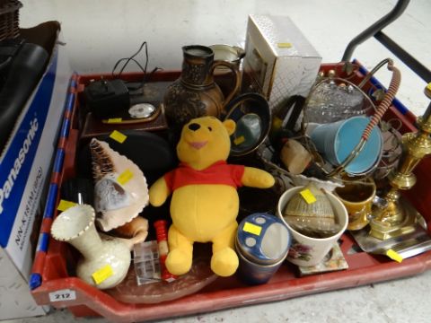 A crate of various household items including brass, glass bowls, ornaments etc
