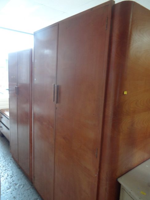 Two Art Deco-style veneered lightwood wardrobes together with a low two-drawer chest of drawers