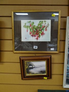 Framed watercolour of fuchsias signed H L dated 1979 together with a small framed oileogram of the boathouse at Laugharne by Pauline Miller