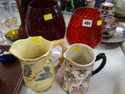 Two ruby glass stemmed balloon vases, an Arthur Wood Kingfisher jug together with a Johnsons Bros jug